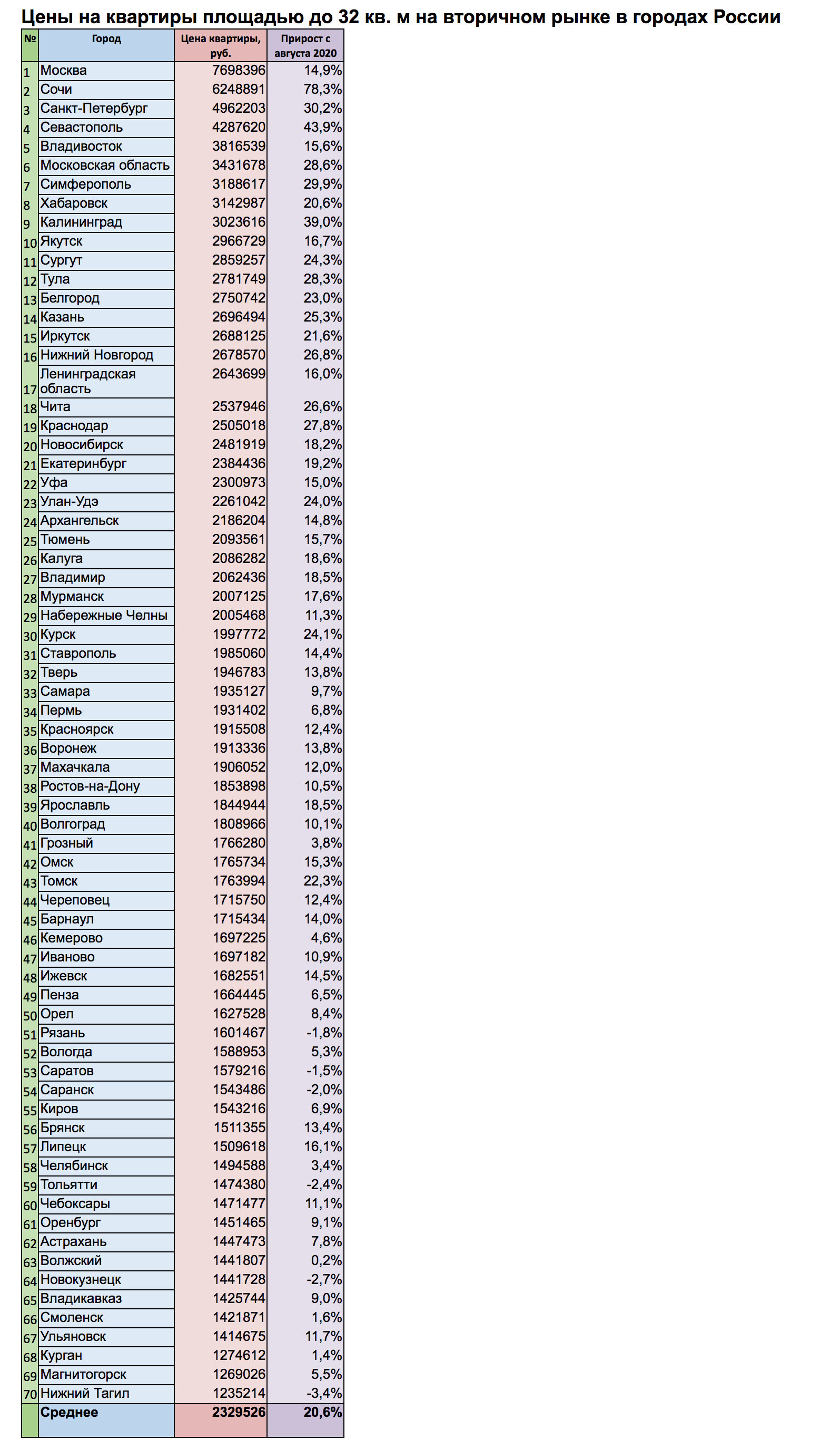 В целом по всем городам средняя стоимость небольших квартир и студий оценивается в 2,33 млн рублей. С прошлого августа она выросла на 20,6%.