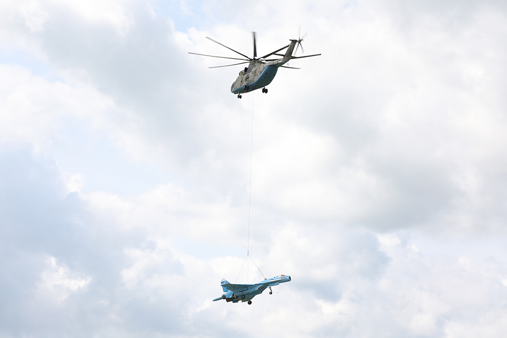 Как сообщает пресс-служба Западного военного округа, летчики крепили, поднимали в воздух, перевозили не только "самолет-истребитель", но и контейнеры с гуманитарной помощью.