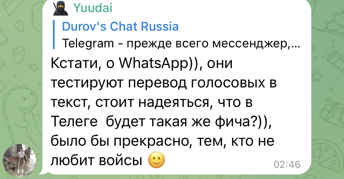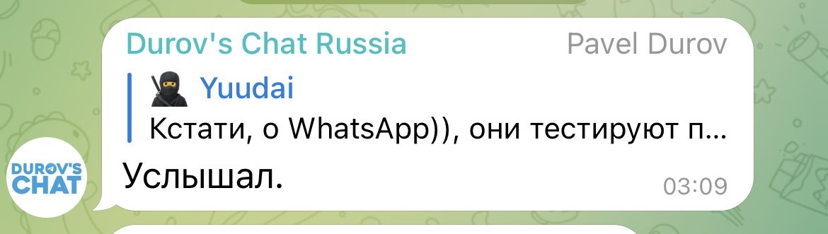 Так, один из пользователей спросил Дурова: "WhatsApp тестирует возможность перевода аудиосообщений в текстовые, есть вероятность, что такая же функция будет в Telegram?" На что Дуров ответил: "Услышал".