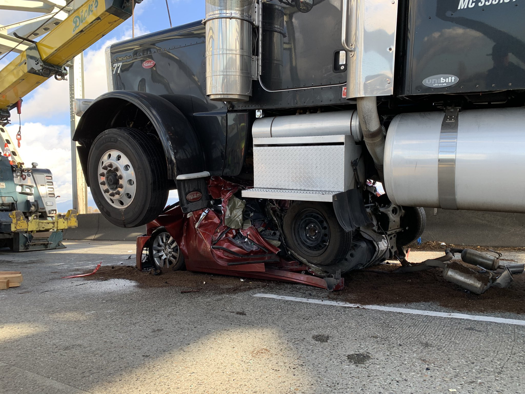 Местные СМИ описывают происшествие так. Обычное утро на федеральной трассе, плотный волнообразно движущийся поток машин, направляющийся к Сиэттлу. Как всегда много грузовиков. Женщина 46 лет за рулем седана Nissan вслед за потоком притормаживала на мосту и вряд ли могла вообразить, что следующие несколько секунд станут самыми страшными в ее жизни.