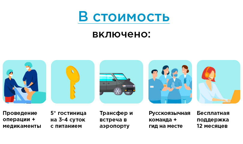 В стоимость пакетного предложения входит: трансфер, гостиница 5* на время пребывания с питанием, осмотр и бесплатная консультация доктора, трансплантация волос по выбранной технологии, все необходимые медикаменты, местная анестезия, препараты и средства для ухода за волосами. Также в стоимость входит 12-месячная поддержка сотрудника, который всегда на связи и сопровождает пациента до заранее оговоренного результата.