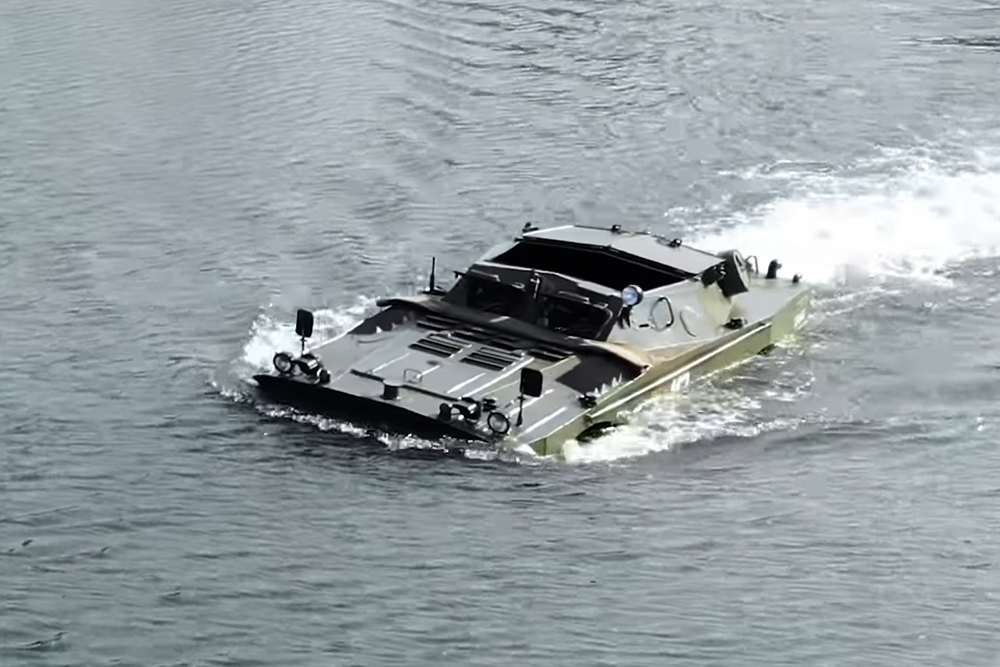 Особенность амфибий - наличие водометной установки и дополнительных четырех колес, опускающихся на грунт, когда возникает необходимость преодоления попавшихся на пути траншей.