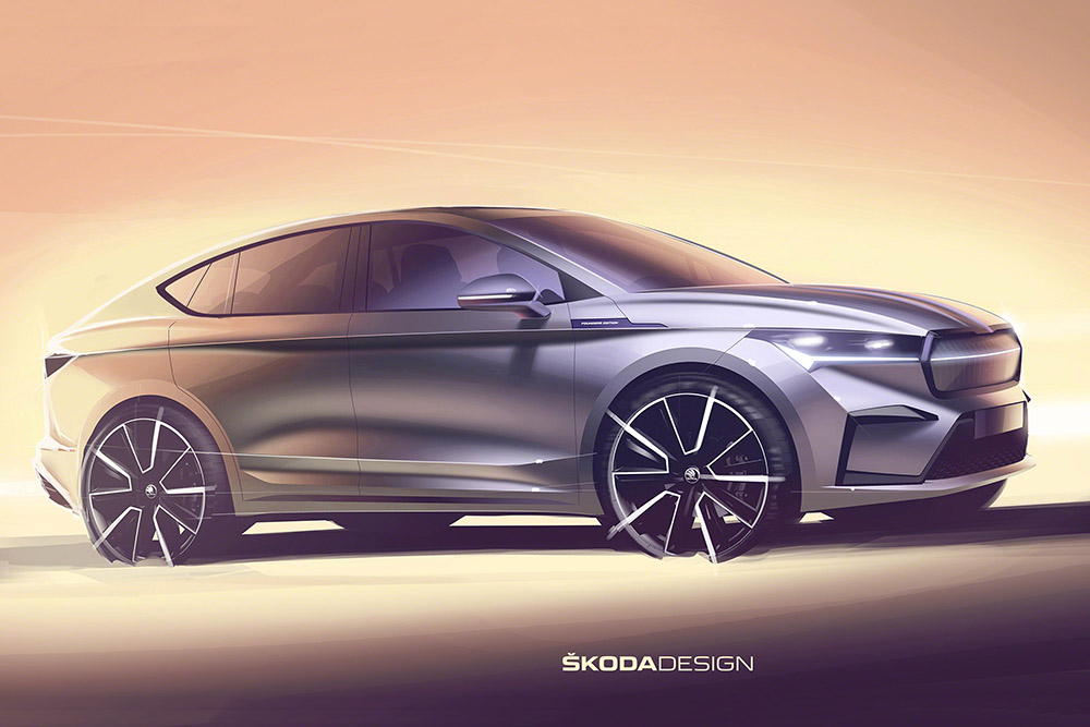 На самом деле скетч малоинформативен, потому что в случае превращения модели в кросс-купе основные изменения происходят с задней частью, а фронтальная остаётся такой же, как у "донора", - в данном случае это первенец электрической линейки Skoda - Enyaq iV. На скетче виден увеличенный наклон крыши и часть фонарей, а вот переформованной крышки багажника не показали.