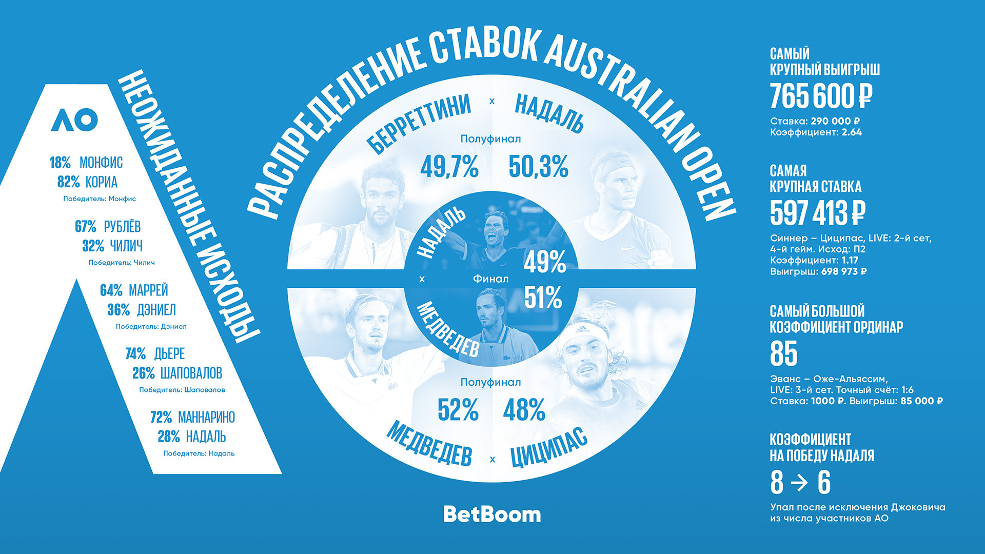 Самый крупный выигрыш на Australian Open был в финале - 765 тысяч рублей. Беттор поставил в лайве 290 тысяч на победу Надаля с коэффициентом 2,64. Кстати, до начала игры фаворитом в BetBoom был Медведев. Коэффициент на его победу составлял 1,52, а на испанца - 2,37. Бетторы тоже верили в россиянина − на него в финале поставило 59% пользователей. Кстати, перед стартом турнира коэффициент на победу Надаля был 8.00.
