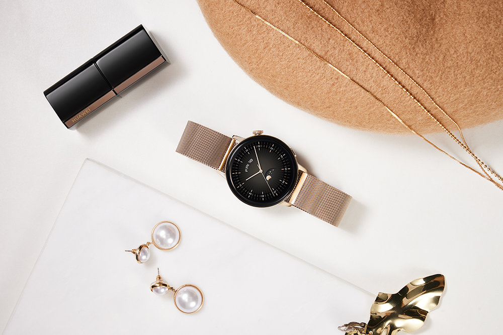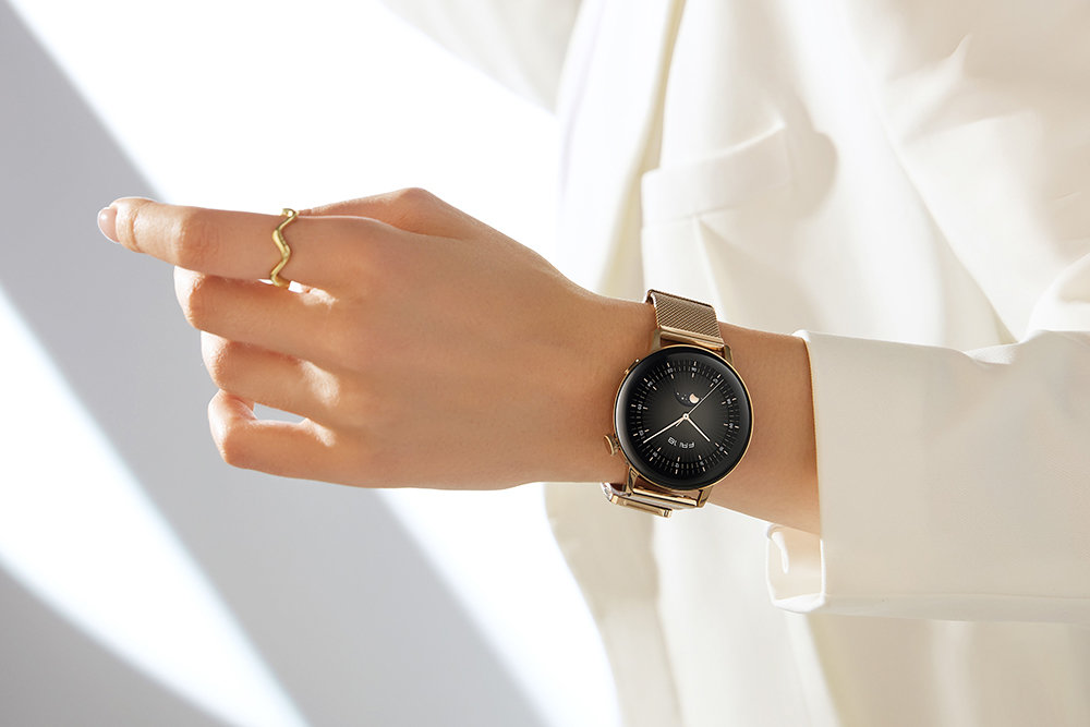 Достойно завершить модный образ помогут смарт-часы Huawei Watch GT 3 в версии Elegant на золотистом миланском браслете. Их сенсорный экран диагональю 1,32 дюйма имеет круглую форму и закрыт выпуклым защитным 3D-стеклом - визуально оно ощущается, будто застывшая капля воды. Металлический браслет, выполненный в стиле "миланской петли", выглядит гладким благодаря особому плетению. Вес устройства не превышает 35 граммов, поэтому часы практически не чувствуются на руке.