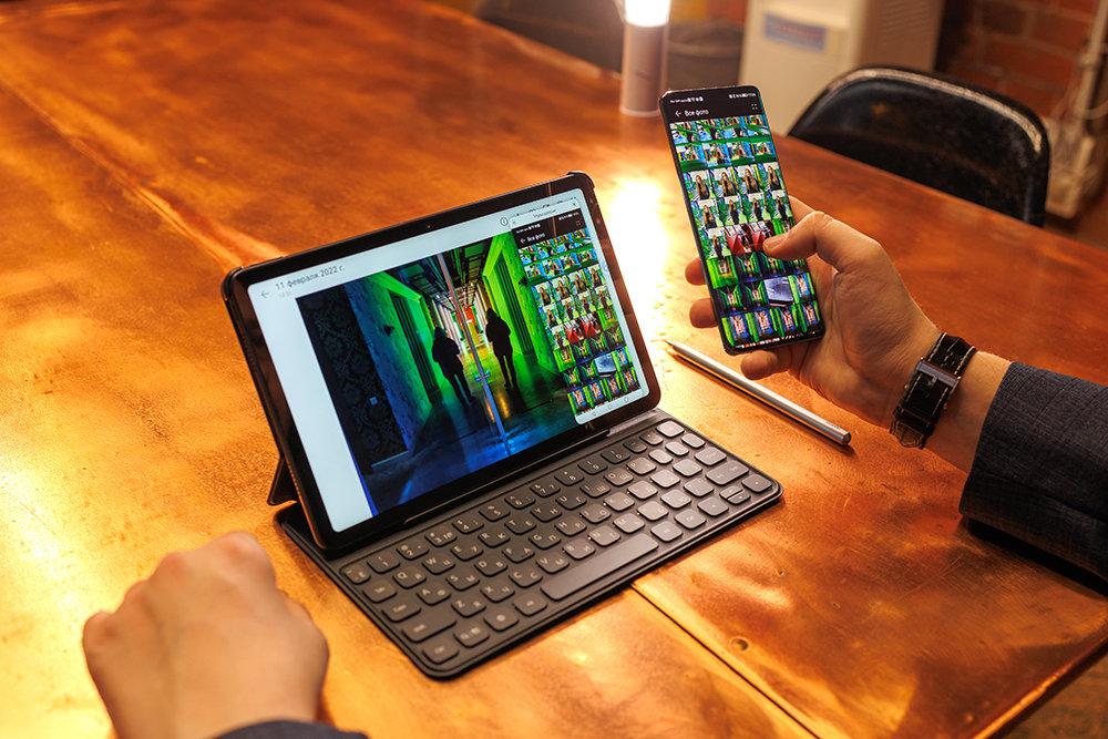 Поддержка экосистемы Huawei позволяет планшету взаимодействовать без проводов не только с привычной периферией, но также со смартфоном и ноутбуком. Экран телефона можно передать на Huawei MatePad с помощью функции "Беспроводная проекция", чтобы работать с мобильными приложениями и перетаскивать файлы с одного устройства на другое простыми жестами.