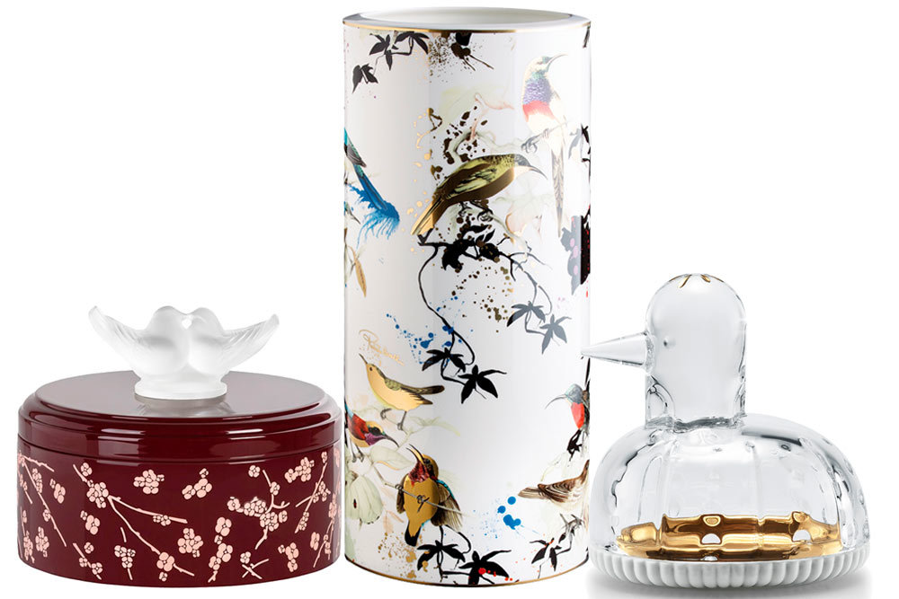 1. Lalique, мини-шкатулка из лакированного дерева с хрустальными птицами / ЦУМ. 2. Roberto Cavalli Home, фарфоровая ваза с позолотой "Птицы в саду", 36 см / Дом Фарфора. 3. Baccarat, шкатулка "Утка", хрусталь и фарфор, высота 11 см. Фото: пресс-службы