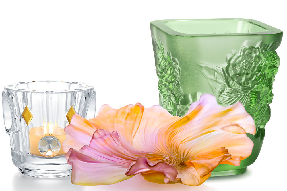 1. Baccarat, хрустальный подсвечник. 2. Daum, хрустальная ваза для фруктов Croisiere / ЦУМ. 3. Lalique, коллекция Botanica, мини-ваза "Пионы" / ЦУМ. Фото: пресс-службы