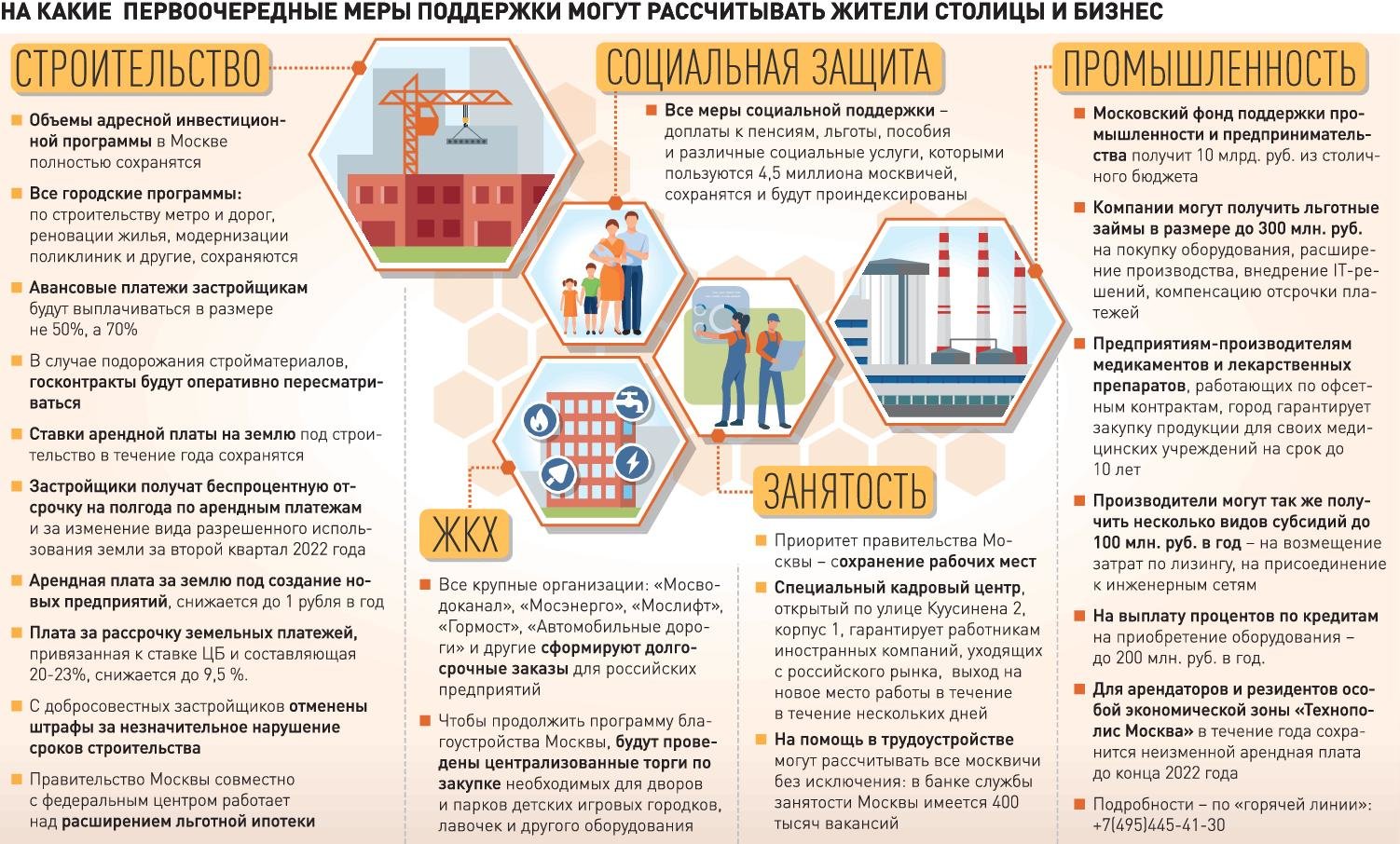 Продолжится строительство метро, дорог, домов по программе реновации и многого другого. Свои меры поддержки разработаны и для тех, кто работает в промышленности и в сфере ЖКХ. Приоритет во всех остальных отраслях городской экономики один - сохранение рабочих мест.