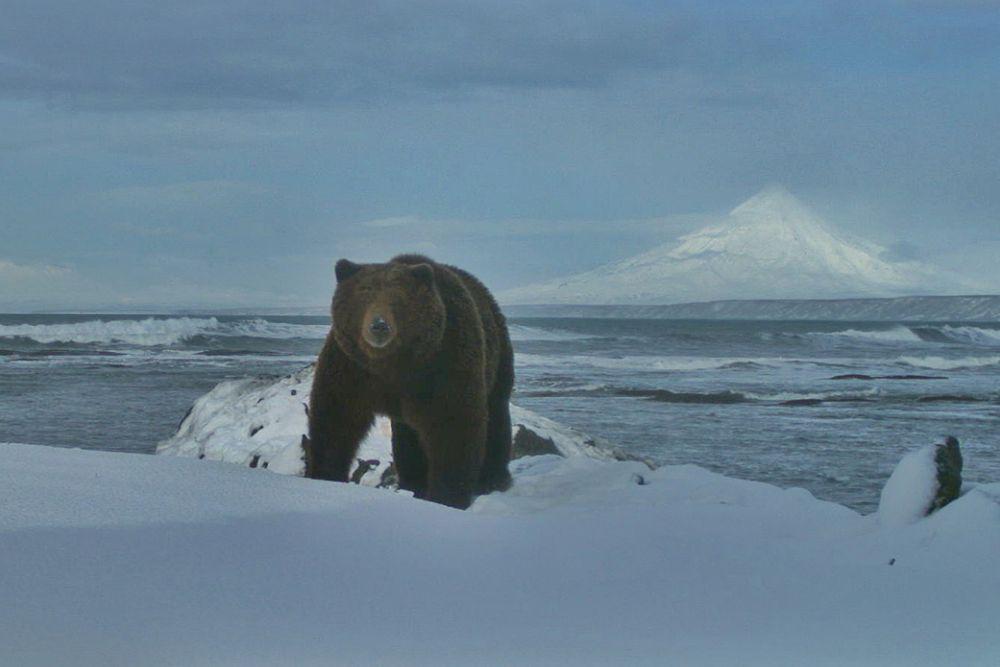 Снимки получились живописными: в кадре на фоне Кроноцкого вулкана красуется хищник, который, вероятно, совсем недавно покинул берлогу.
