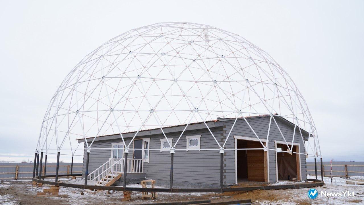 В 40 километрах от Якутска на испытательном полигоне Северо-Восточного федерального университета (СВФУ) построили деревянный дом площадью 128 квадратных метров. Внутри просторная кухня-гостиная, две спальни, санузел с душевой кабиной и гараж на две машины с отдельным входом. А снаружи... 20-метровая стальная полусфера.