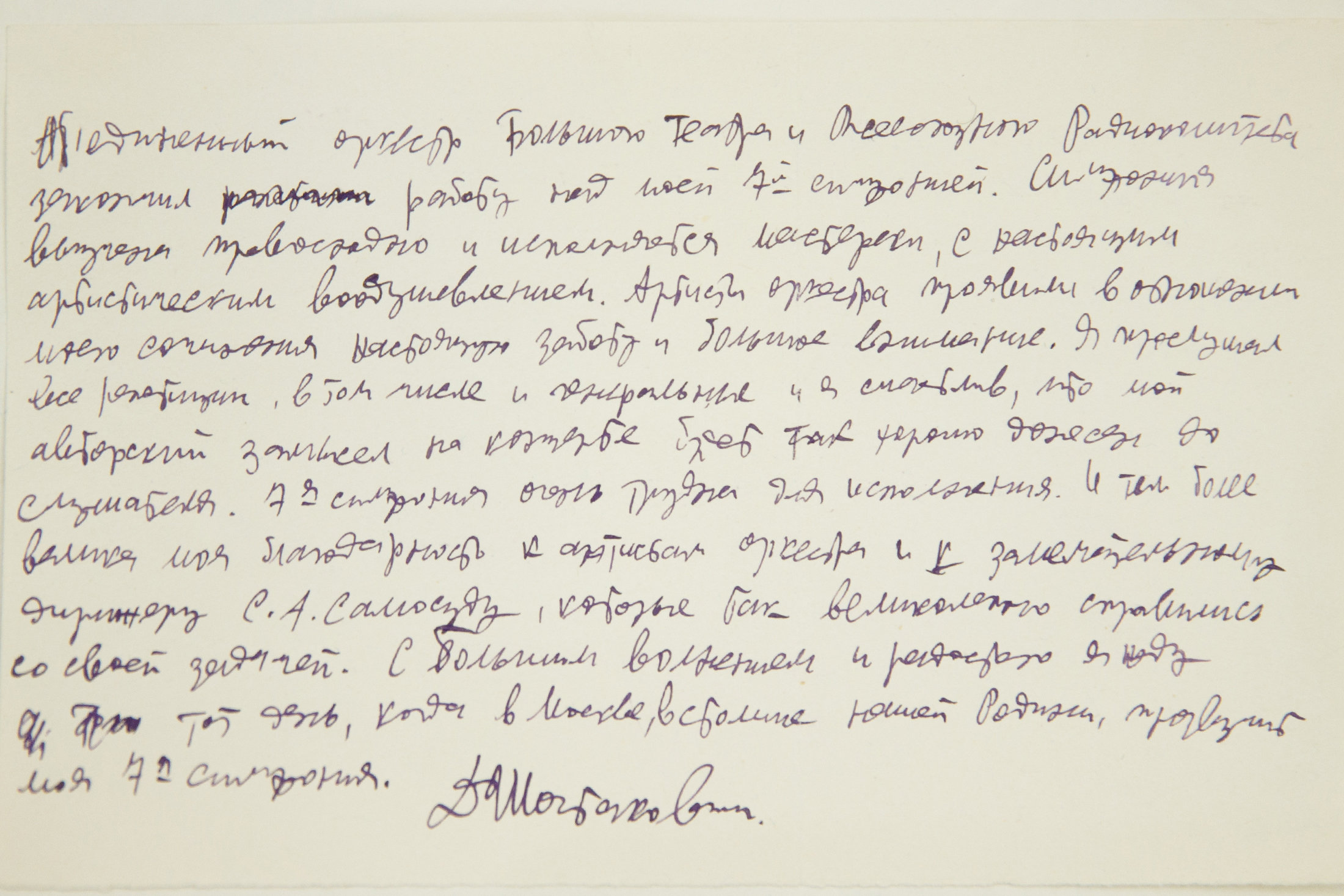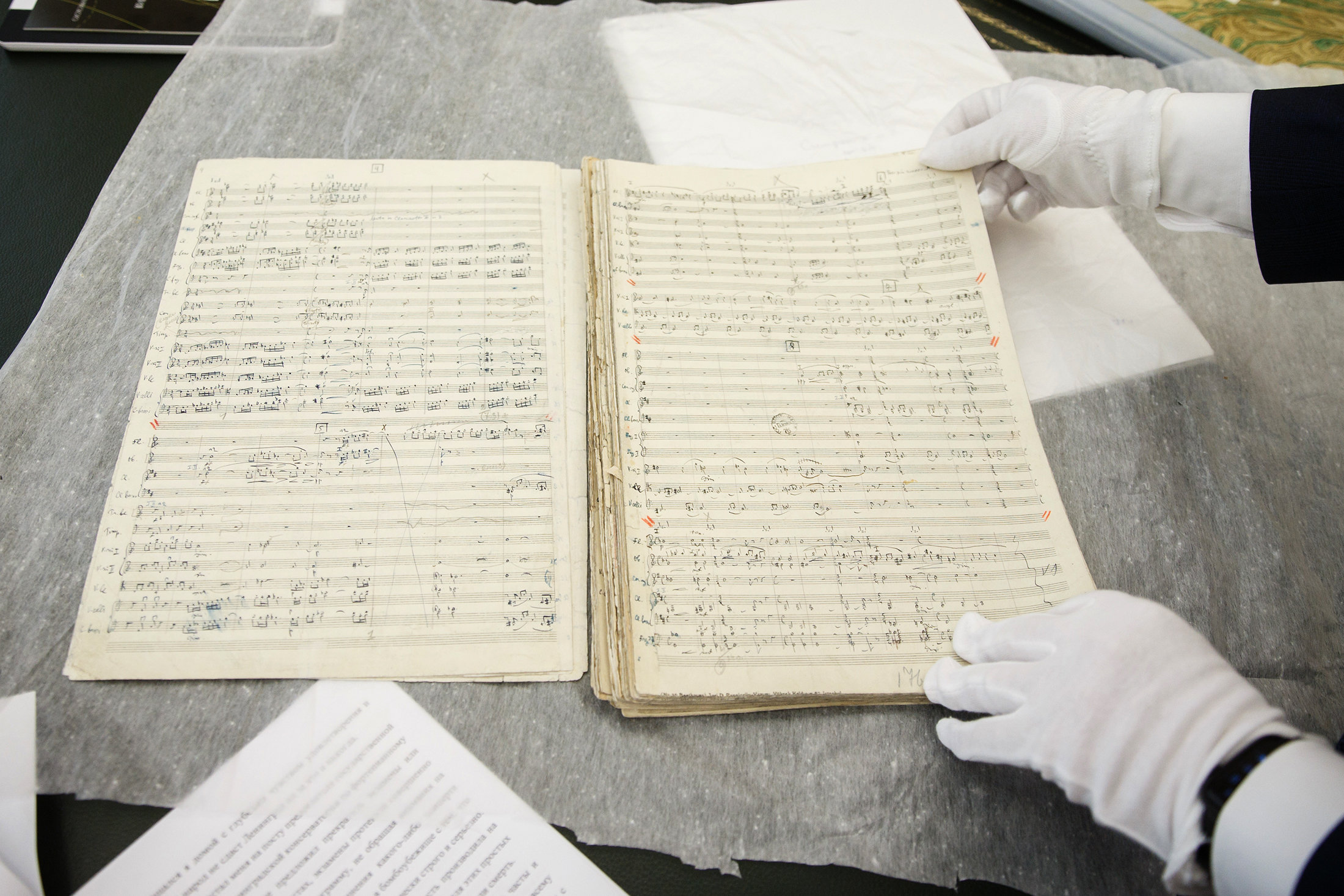 Михаил Брызгалов: Открытия большие и малые происходят постоянно. Для специалиста любой знак, обозначение в нотах имеет значение. Вот Шостакович сделал здесь пометку, потому что хотел обратить внимание музыканта, чтобы он сыграл определенным образом. Именно для того, чтобы увидеть эти бесценные пометки, в музей приходят дирижеры, режиссеры, музыканты. Они часами сидят в читальном зале над оригиналами партитур и будто ведут разговор с композитором, выясняют у него, что было задумано, как лучше сыграть. Самое удивительное, что в этих пометках каждый исполнитель находит что-то свое, и каждый раз это открытие.