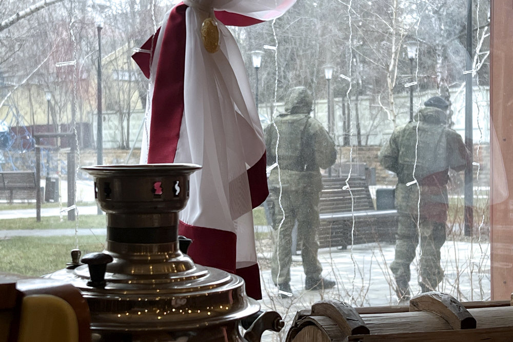 В Белгороде повышены меры безопасности. Еще вчера у городской администрации дежурил один полицейский. Сегодня к нему присоединились росгвардейцы. На всех значимых перекрестках в центре города дежурят люди в камуфляже и с автоматами. А так в городе - обычная жизнь, работают магазины и кафе. Очередей не наблюдается.