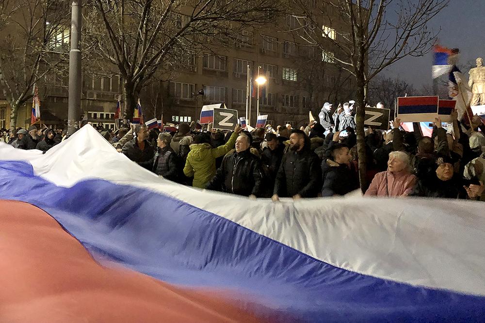В сербской столице в эти минуты проходит многотысячная акция в поддержку России. Как сообщают агентства, в центре города видны флаги РФ, а также Донецкой и Луганской республик. Мероприятие в частности приурочено к состоявшемуся на прошлой неделе голосованию по приостановке членства России в Совете ООН по правам человека.