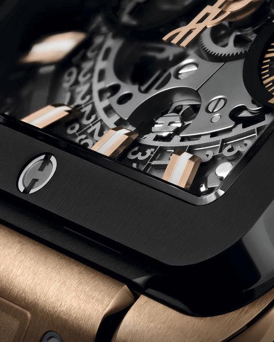Она вызвала интерес Hublot потому, что ставит немало сложных задач. Во-первых, механизм часов должен быть круглым. Поместить его в квадратный корпус - сложная задача. Именно поэтому большинство часовых производителей скрывают механизм, чтобы создать иллюзию, что он обладает той же формой, что и корпус. Компания Hublot приняла радикально новое решение: не скрывать собственный механизм Unico. Колонное колесо хронографа просматривается в положении "6 часов". Благодаря сэндвич-конструкции циферблата создается эффект многоуровневой глубины.