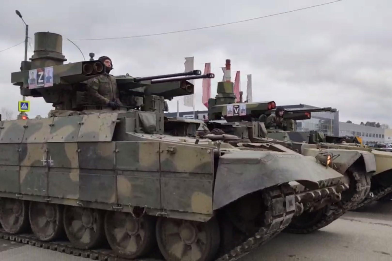 Портреты кавалеров Золотой Звезды полковника Камила Салимханова, подполковника Николая Артемова, майора Дмитрия Абакумова и старшего лейтенанта Нурмагомеда Гаджимагомедова уже закрепили на боевой машине поддержки танков (БМПТ). Там же находятся два символа спецоперации - латинские буквы Z ("Zа победу") и V ("Сила V правде").