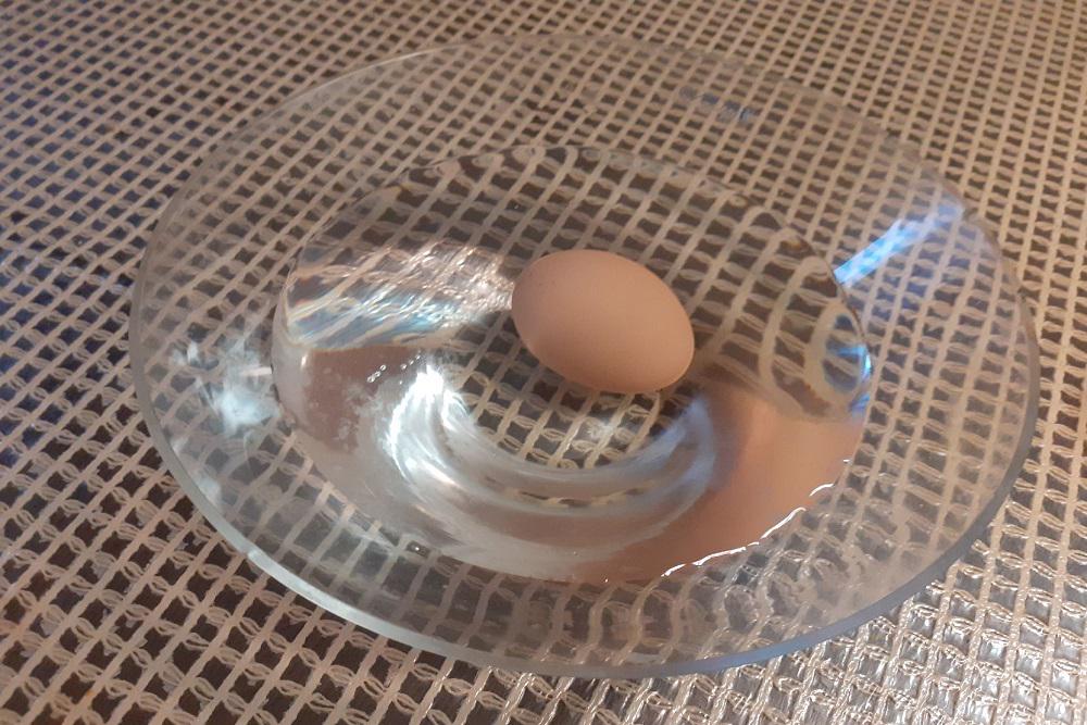 Поместите яйцо в чашку с холодной водой. Свежее яйцо обязательно спустится на дно и займет горизонтальное положение.