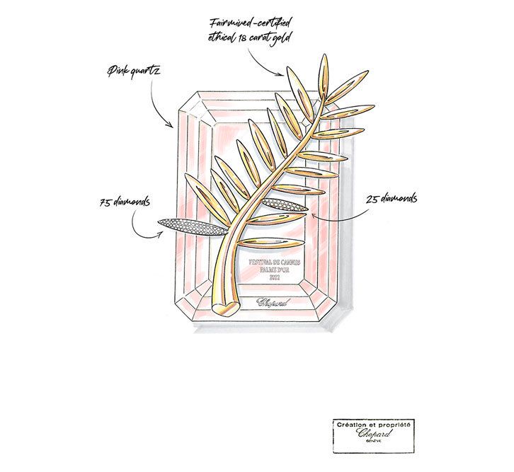 Два листа ветви усыпаны бриллиантами: на первом их 75 (соответственно возрасту фестиваля), на втором - 25 (в честь партнерства Канн с Chopard). Бриллианты получены от поставщиков, сертифицированных Советом по ответственной ювелирной практике. Основание награды - не из горного хрусталя, как в предыдущие годы, а из розового кварца, который в греческой мифологии считался камнем Афродиты, богини любви и красоты. Каролина Шойфеле, сопрезидент и креативный директор Chopard, говорит, что с миром кино и с фестивалем ее связывает искренняя любовь.