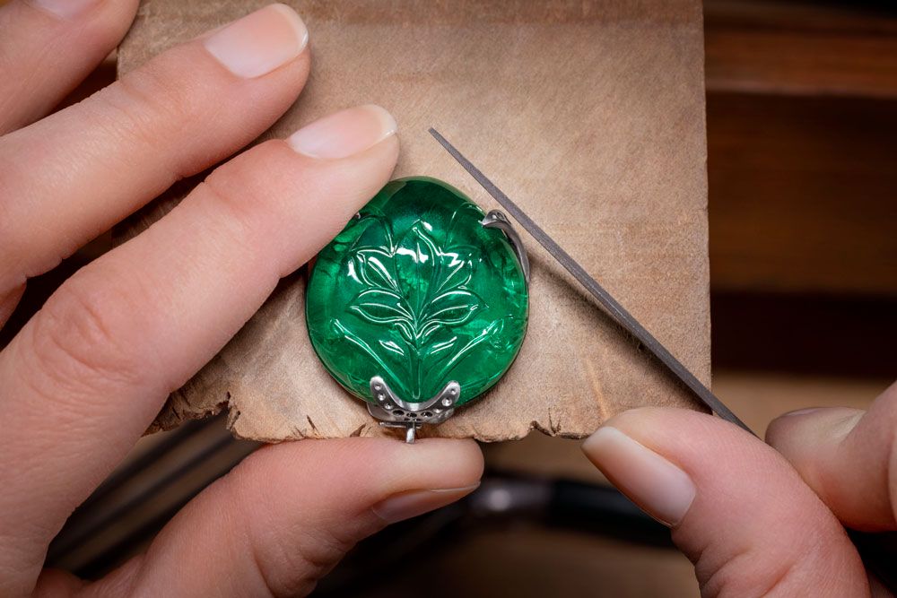 Над созданием тиары мастер-ювелир с командой из пяти человек работали 1500 часов, причем два человека занимались исключительно ручной закрепкой драгоценных камней. Дизайн выполнен в форме цветочного букета. Тиару венчает огромный замбийский изумруд в 63,44 карата с резным цветущим лотосом. Искусная резьба еще больше подчеркивает красоту драгоценного камня.