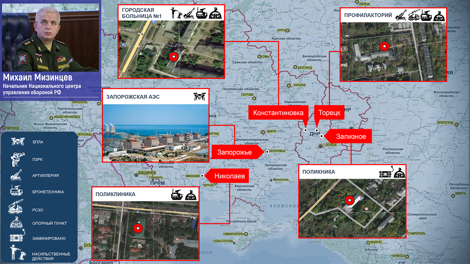 По его словам, в Константиновке Донецкой Народной Республики в городской больнице №1 по проспекту О. Тихого националисты оборудовали опорные пункты. На прилегающей к больнице территории они разместили бронетехнику и артиллерию. В помещениях медицинского учреждения неонацисты под предлогом якобы обеспечения безопасности удерживают персонал и пациентов больницы. Фактически этих людей используют в качестве "живого щита".