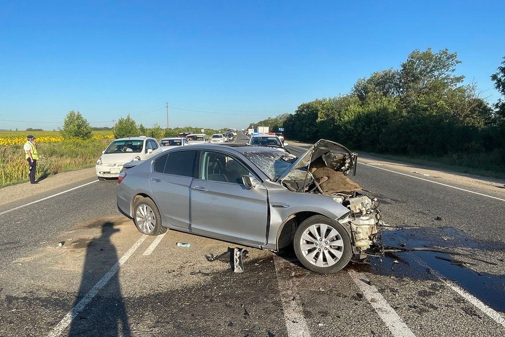 Авария произошла утром 9 августа. По предварительным данным, водитель автомобиля Honda Accord двигался со стороны Краснодара в Новороссийск, выехал на встречную полосу движения и столкнулся там с LADA Largus. После этого в отечественный автомобиль также врезался двигавшейся сзади ВАЗ-2114.