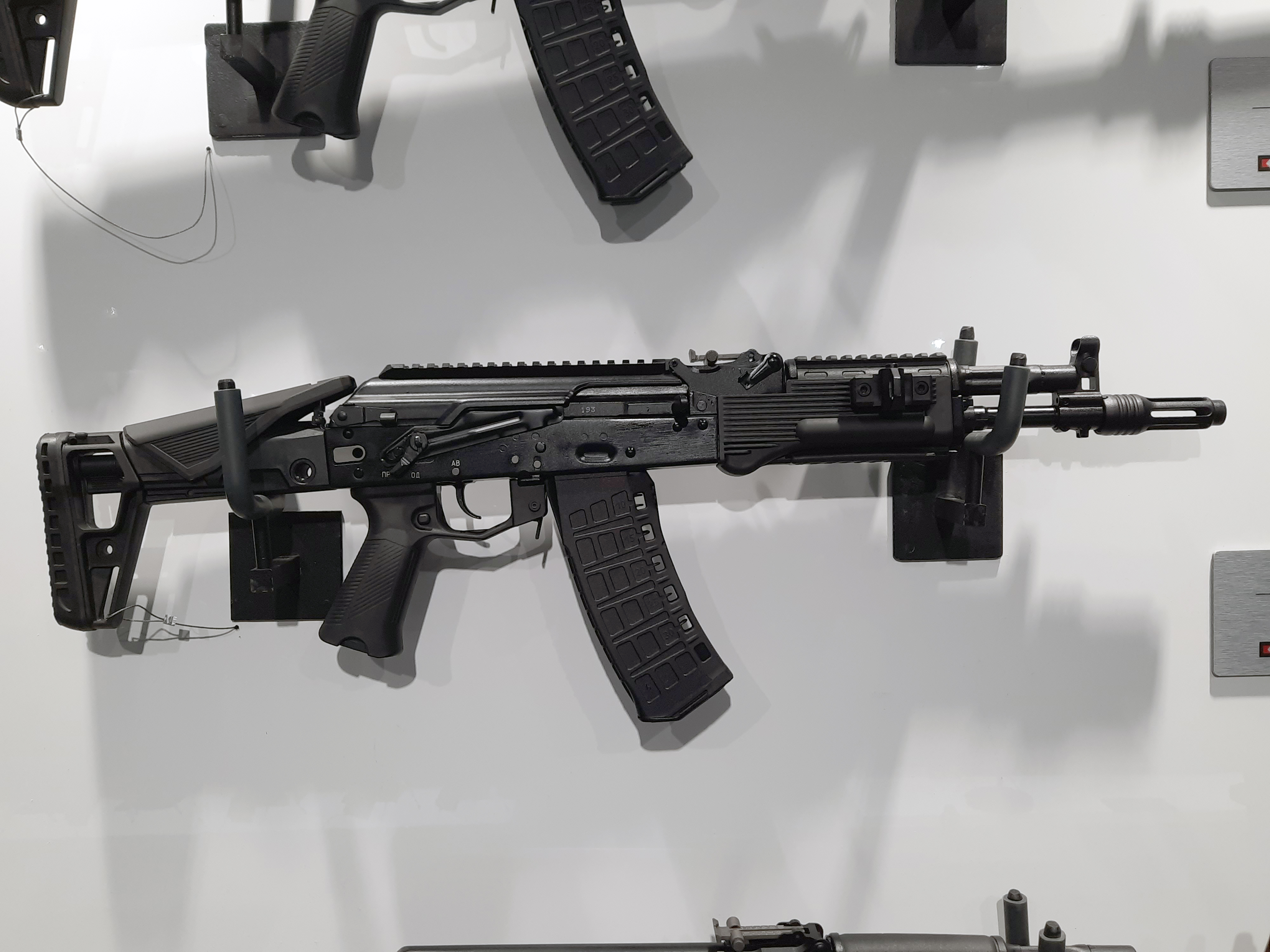 Посетителям форума показали модернизированный АК-205. У него был изменен приклад, что позволило снизить общую массу. Также установлен двухсторонний флажок предохранителя, по удобству он значительно превосходит старый. Еще одно отличие этой версии автомата - новая эргономичная пистолетная рукоятка.