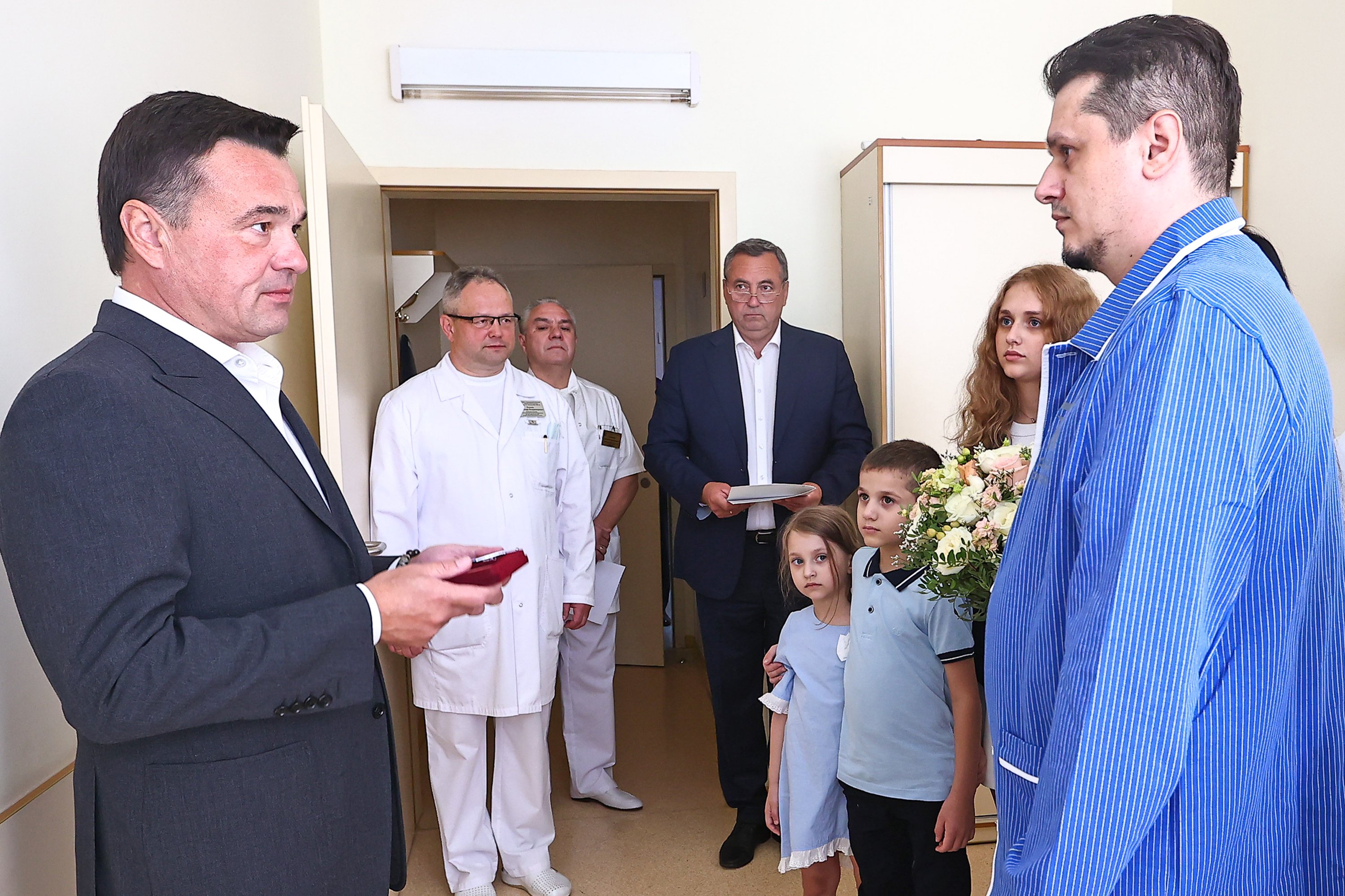 "Сегодня в присутствии семьи я хочу вам вручить эту награду, еще раз поблагодарить, пожать руку. Это очень высокая награда, вы - настоящий герой, сильный человек. Особенное восхищение вызывает тот факт, что вы - отец пятерых детей, уверен, они гордятся вами", - отметил Воробьев, вручая медаль герою.