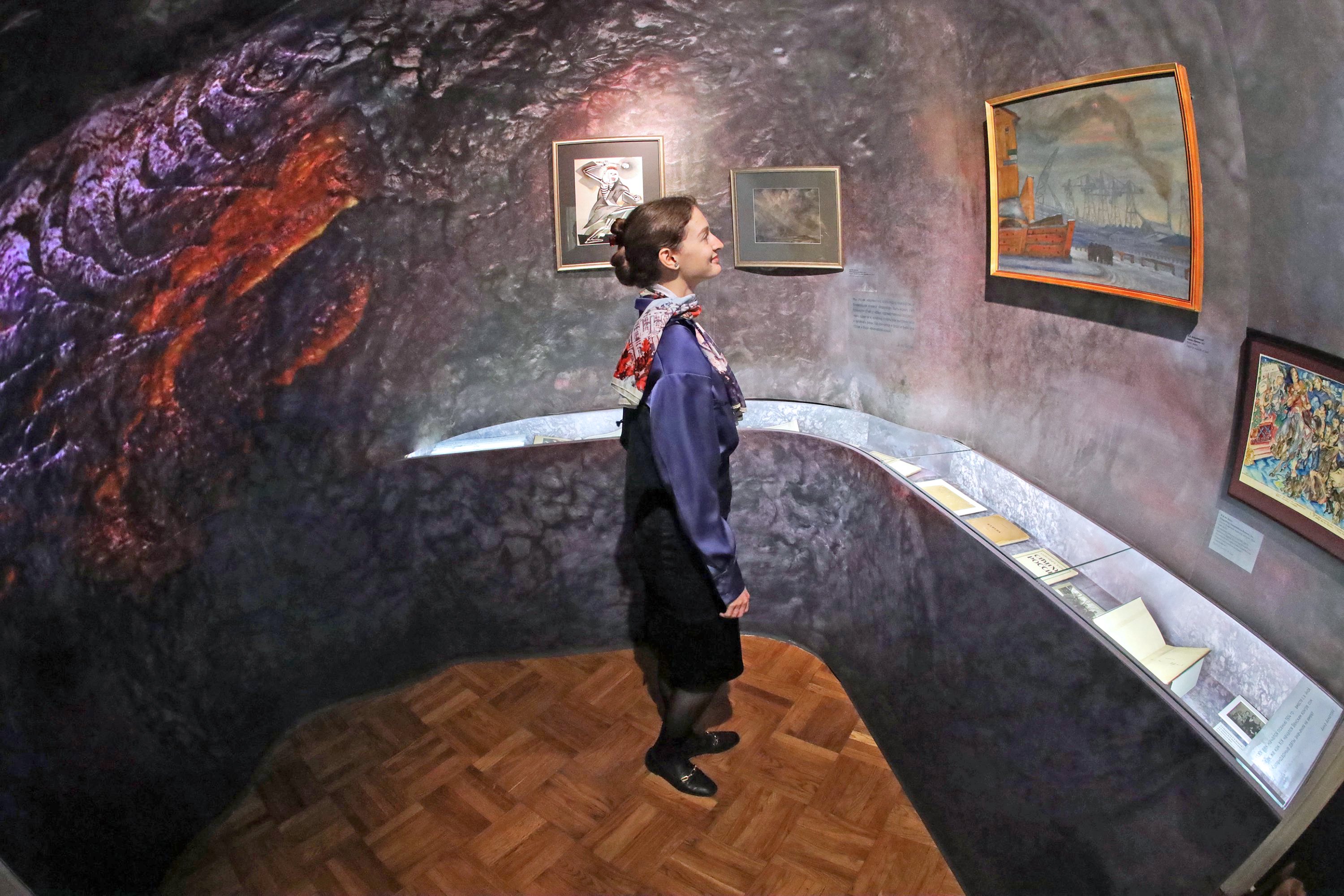 Между тем, оттенок стен выставки "От "Мира искусства" к "Аполлону..." по мере продвижения по ней - темнеет. Питерский дизайнер Юрий Сучков придумал образ раковины, за хрупкими стенками которой тщетно пытался спрятаться от назревавших войн и революций идеальный, но, по сути, беззащитный мир Дягилева, Бакста, Лансере и Коровина. Стены поначалу словно переливаются серо-голубым перламутром, к финалу выставки "истончающимся", все темнеющим и темнеющим. Зал, посвященный журналу "Аполлон", основанному Николаем Гумилевым и Сергеем Маковским выходившему до осени 1918, завершается акварельным эскизом "Пляска смерти" Альтмана, шаржами, высмеивающими военно-патриотический угар, фотографией Блока в военной шинели и его стихотворением "Рожденные в года глухие...". В котором есть строки "В сердцах, восторженных когда-то, есть роковая пустота..."