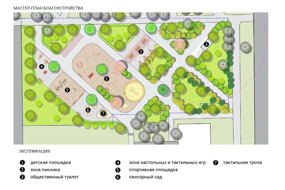 А в западной части сквера расположатся спортивная площадка, зона настольных игр и сенсорный сад с различными растениями, природными материалами и тактильной тропой, покрытие которой специально подготовят для ходьбы босиком, чтобы отдыхающие могли укреплять стопы.