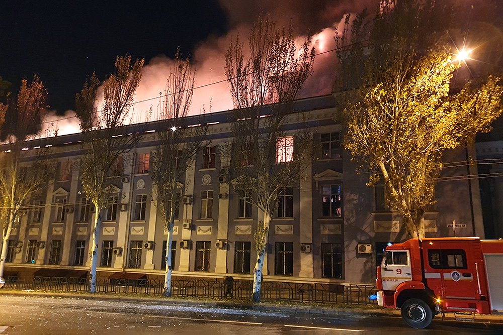 В результате обстрела, в частности, пострадало здание управления железных дорог. Загорелась крыша. Также огонь виден в окнах верхних этажей. Асфальт возле здания усеян битым стеклом. Работают пожарные расчеты.