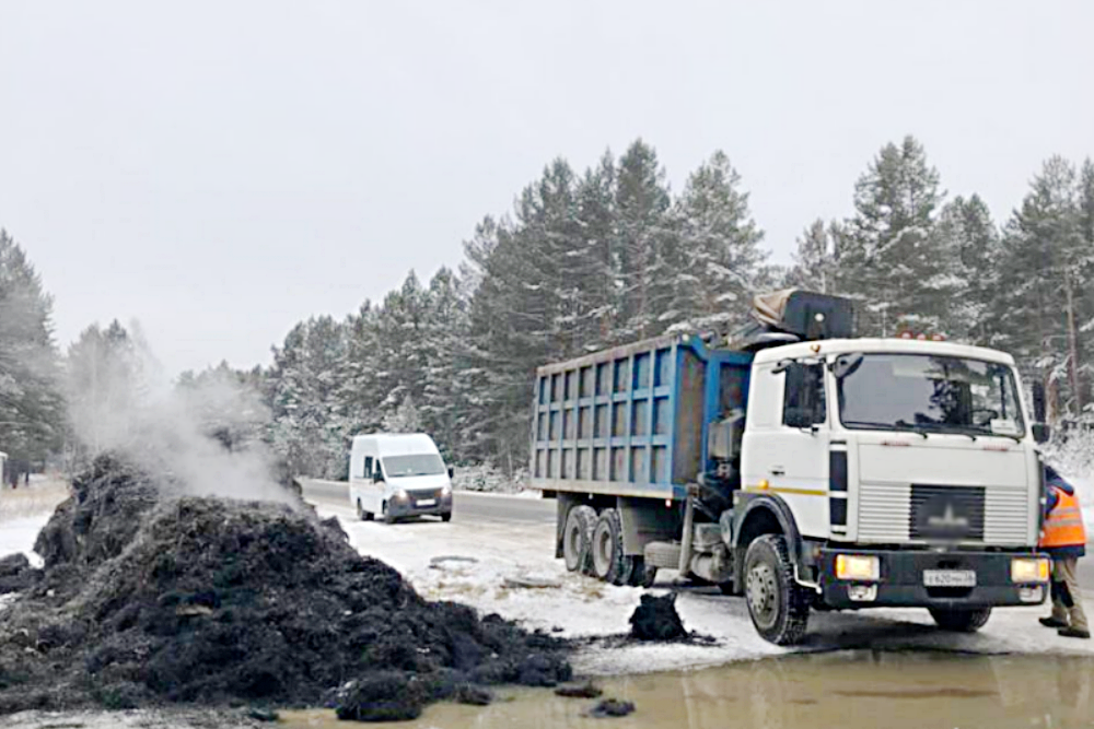 В среду утром пожарным Иркутской области дважды пришлось выезжать на тушение замасленной металлической стружки, которую перевозил самосвал.