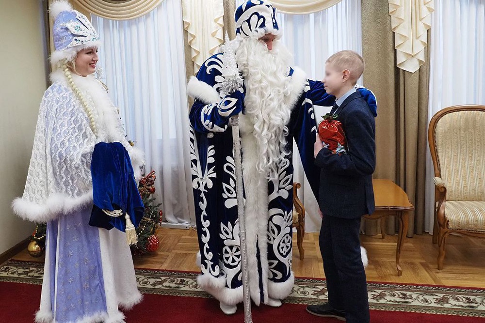 После беседы с главой РМ гостей встретили Дед Мороз и Снегурочка. Они вручили мальчику сладкий подарок и пожелали счастливого Нового года.
