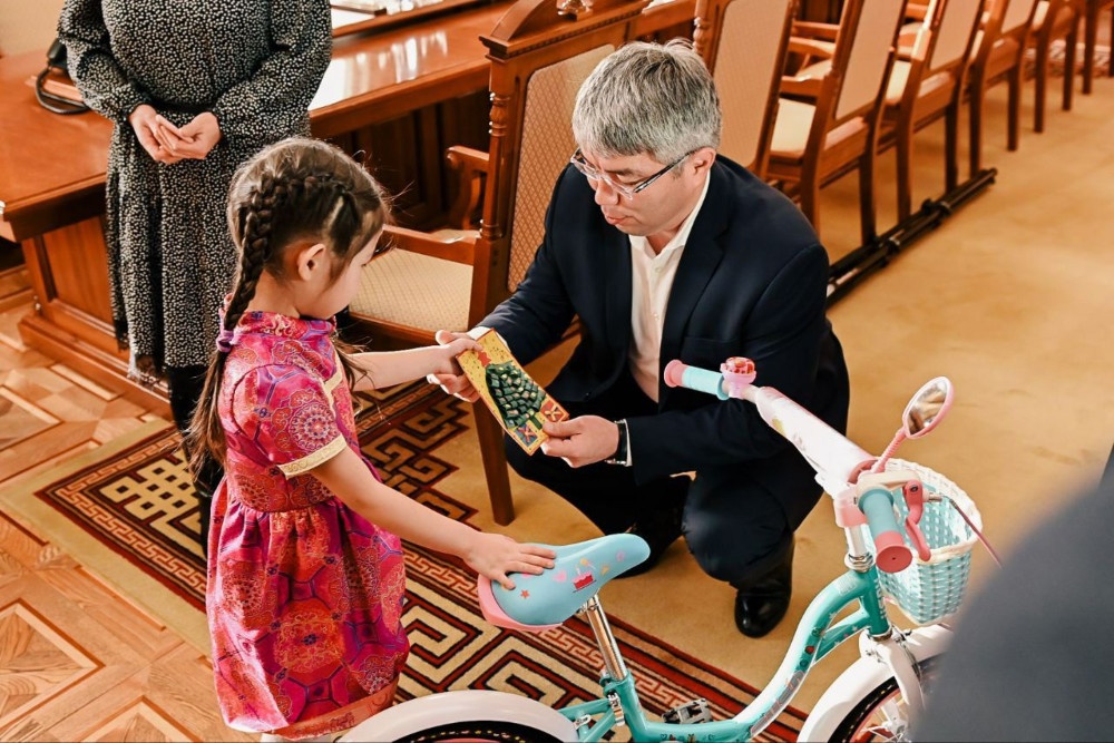 Саша Шаракчинова из поселка Заиграево мечтала о велосипеде. Глава республики подарил его девочке, и она опробовала его прямо в рабочем кабинете Циденова.