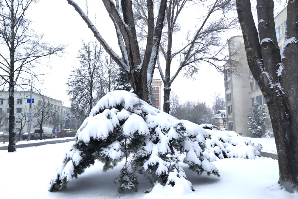 Пушистые хлопья в Минске сыпали всю ночь и ещё половину дня. Здания в снежной дымке. Ветер поднимает белые вихри. Некоторые горожане вновь достали зимнюю одежду.