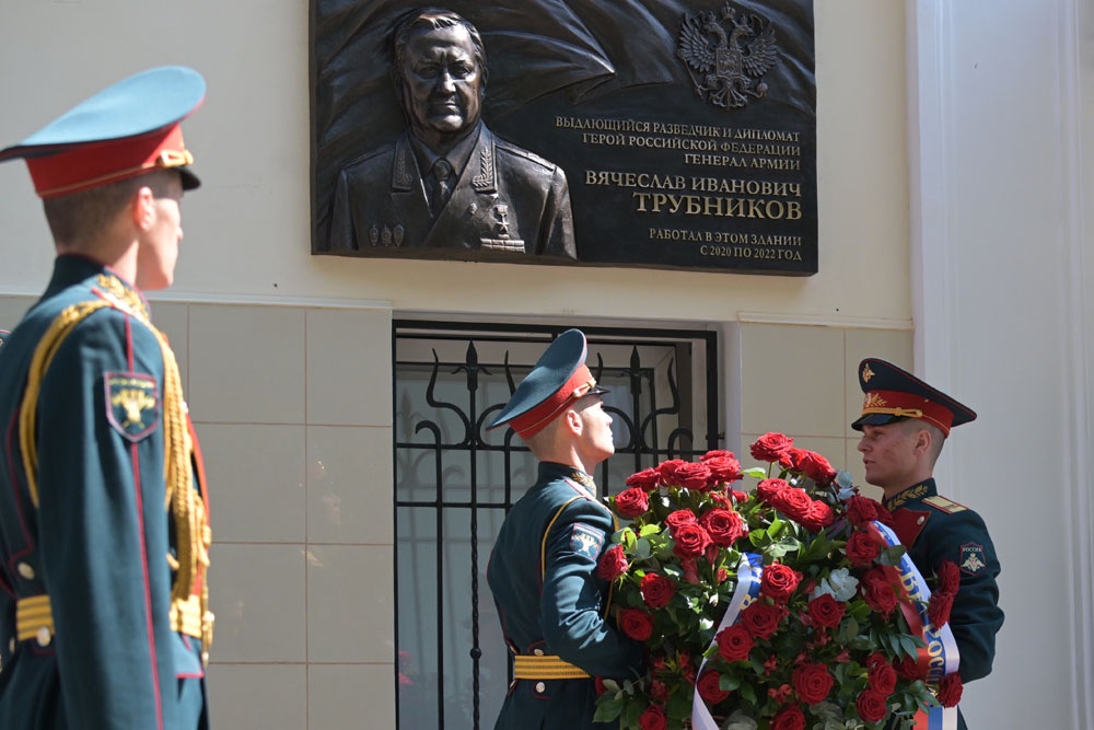 Очень тепло говорил о своем предшественнике Сергей Евгеньевич Нарышкин. Напомнил, что с именем Трубникова во многом связана история советской и российской разведки. От слушателя Академии, оперативника, аналитика Трубниковым был пройден нелегкий путь до директора внешней разведки. В сложные для страны 90-е годы Вячеслав Иванович сделал многое, чтобы отечественная разведка несмотря ни на что оставалась сильной. Судьба связала Трубникова с Индией. Индийские коллеги восхищались его эрудицией, энциклопедическими знаниями. И посол Вячеслав Трубников легко устанавливал деловые отношения со всеми, с кем приходилось общаться. Мемориальная доска - это высочайшее признание заслуг генерала армии и посла Трубникова перед Отечеством.