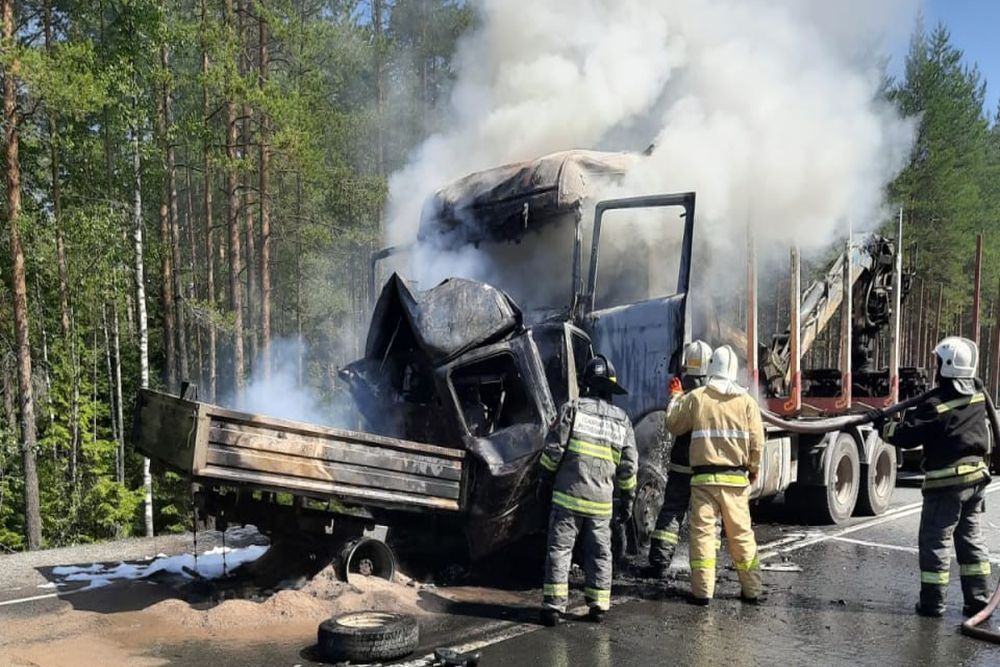 ЧП произошло примерно в 10.20 у поселка Матросы недалеко от Петрозаводска. По предварительным данным, водитель лесовоза сумел сразу выбраться из кабины.