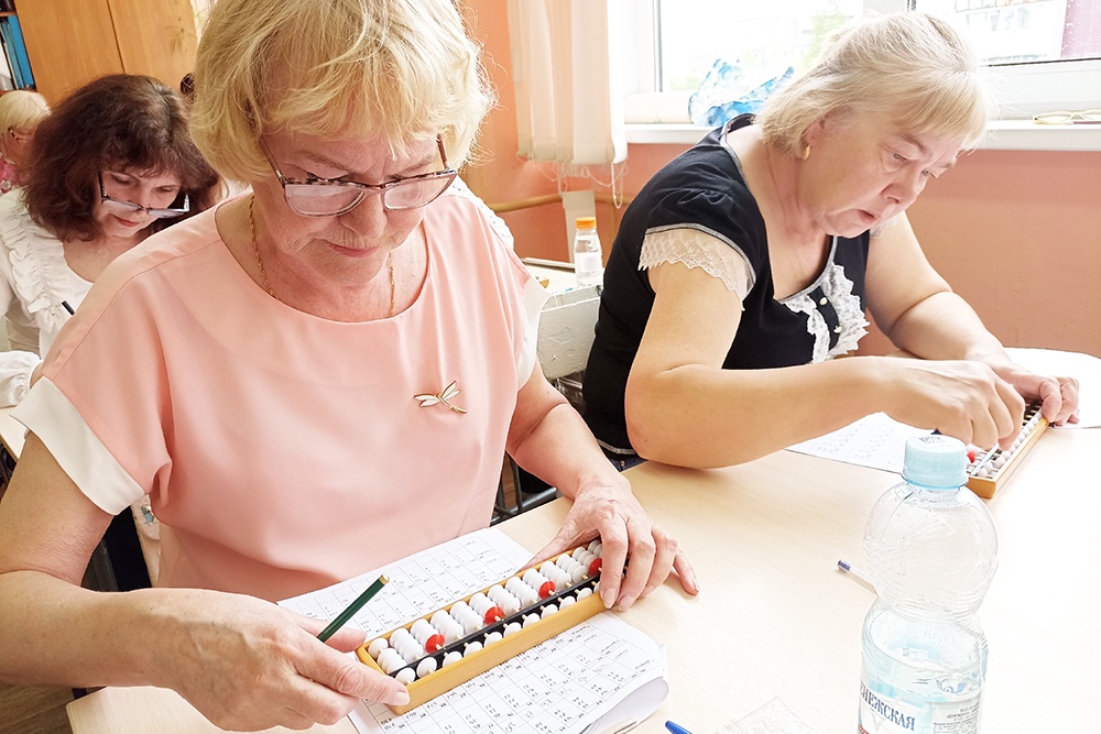 Занятия проходят в течение трех месяцев один раз в неделю по полтора часа. За это время пенсионеры знакомятся с ментальной арифметикой, считают на японских счетах - абакус. Они действительно почти как в школе, выходят на занятиях к доске и получают домашнее задание. Усердны и внимательны.