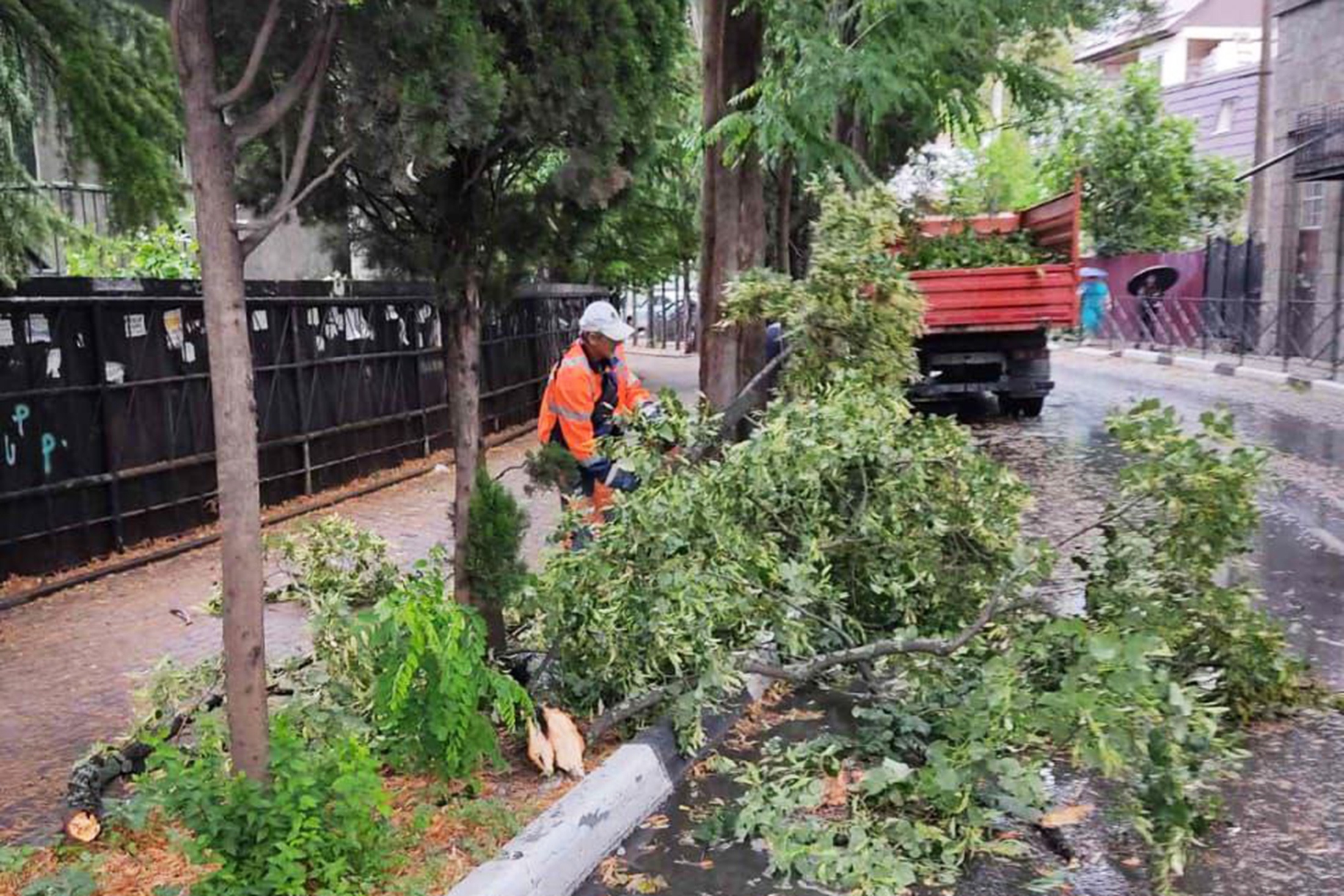 Работники городских служб приступили к ликвидации последствий ночного ливня. В результате усиления ветра, града и выпавших осадков в Ялте повалено 15 деревьев на улице Красноармейской. Поврежден один легковой автомобиль. К работам привлечено 500 человек.