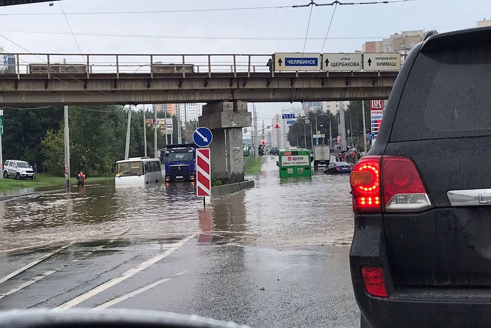 Дорога под железнодорожным мостом, под которым пролегает маршрут общественного транспорта, полностью ушла под воду. А так как в этом месте низина, то "озеро" получилось довольно глубоким.