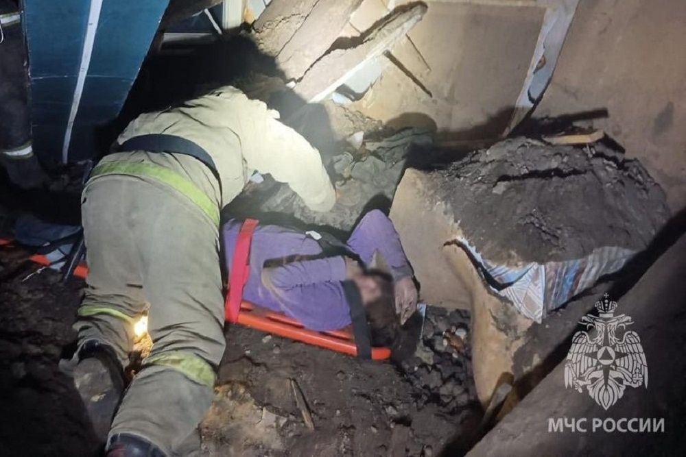 На место первыми прибыли сотрудники пятой и седьмой пожарно-спасательных частей. Сначала извлекли из-под завалов 43-летнюю женщину. На жестком щите ее транспортировали до машины скорой помощи.