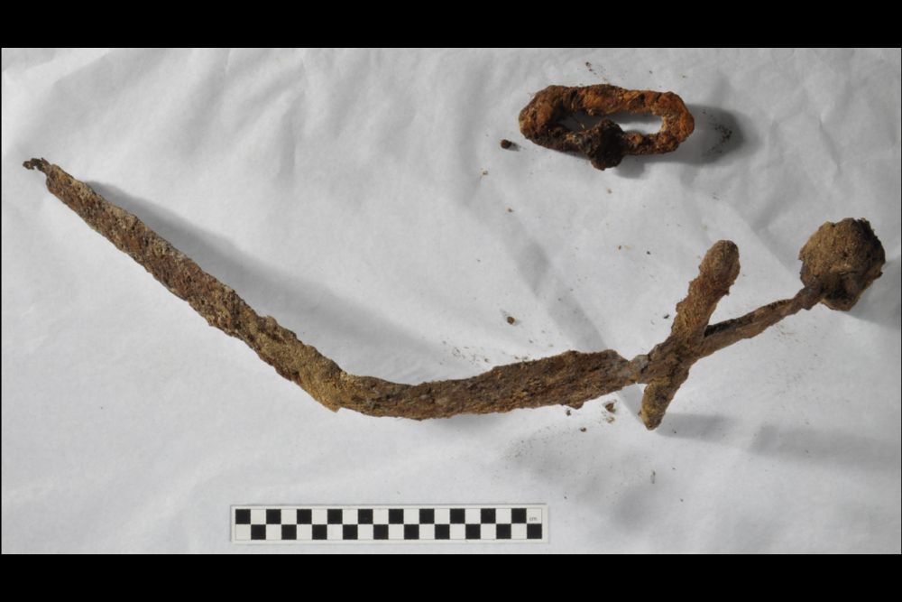 Проведенные раскопки показали, что умерших людей на этом новооткрытом кладбище хоронили по христианским обычаям. Помимо меча археологи раскопали часть ножен, железные предметы "неустановленной природы", а также остатки кожаного ремня, украшенного тридцатью квадратными бронзовыми подвесками и розеточными узорами. К ремню также крепился нож. Найти его не удалось, но археологи раскопали оставшиеся от него кожаные ножны, украшенные бронзовыми кольцами.