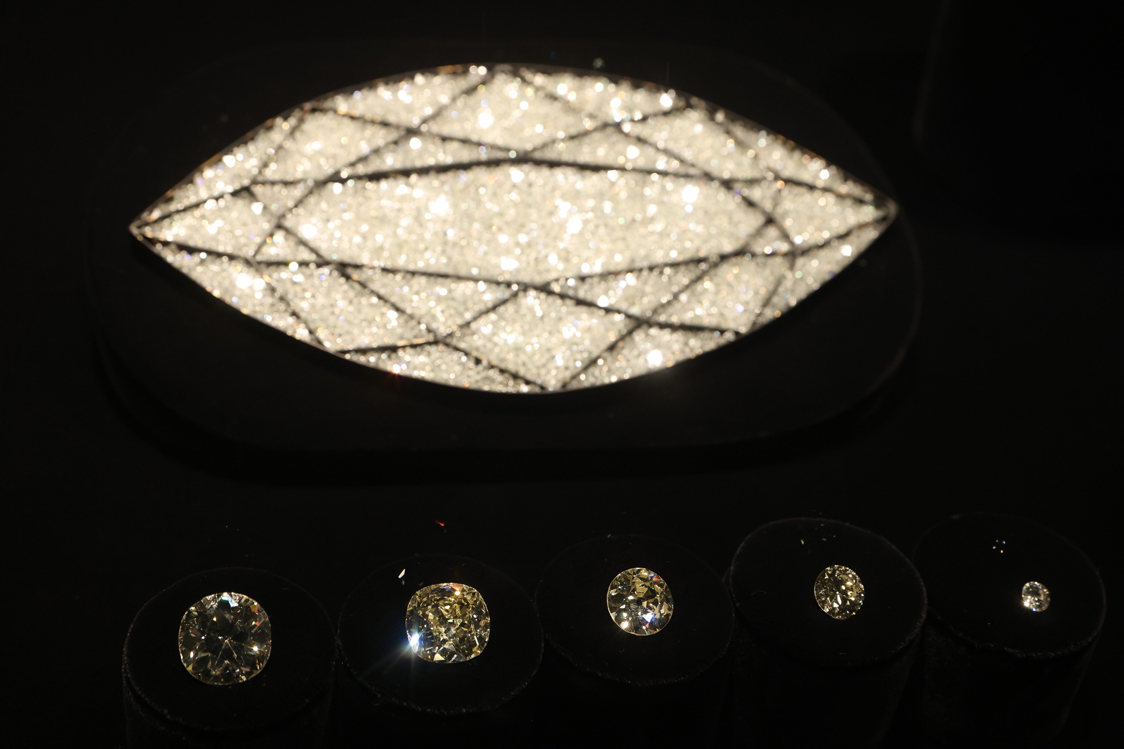- У современных посетителей выставки есть преимущество перед посетителями советской эпохи. Тогда барьер не позволял приблизиться к стеклу витрины ближе, чем на 1,5 метра. Сейчас это расстояние сокращено вдвое, что позволяет рассмотреть самые интересные экспонаты. Например, надписи и нюансы огранки таких мировых раритетов, как потрясающий бриллиант "Шах", которым персы пытались откупиться за убийство Грибоедова. Расстояние важно для детального рассмотрения ордена Золотого Руна, он инкрустирован редкими розовато-лиловыми топазами. Или "Большой букет" императрицы Елизаветы Петровны работы самого Иеремии Позье. И еще десятков экспонатов.