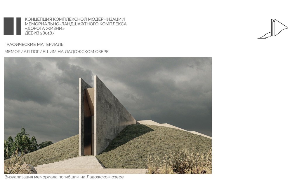 Например, проект вышедшей в финал команды СПб ГАСУ сосредоточился на органических архитектурных формах, гармонично взаимодействующих с природной средой. В рамках этой концепции на берегу Ладоги в Коккорево предлагается возвести новый монумент - насыпной курган, "прорубленный" двумя бетонными плитами с залом внутри. Сверху пространство искусственного холма перекрыто прочным прозрачным материалом, по которому могут ходить люди. Находящиеся в зале посетители будут воспринимать людей наверху как идущих по льду замерзшего озера. Пробивающаяся сверху полоска света создаст особое настроение внутри мемориала. Основные материалы этой концепции - шлифованная сталь, бетон, гранит, стекло.