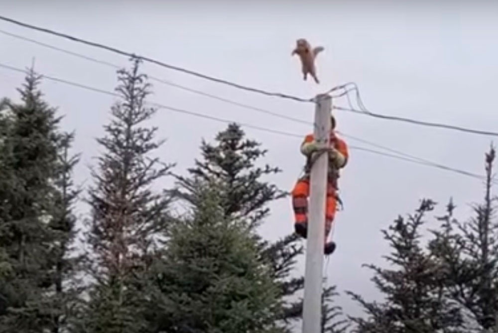 Кот, застрявший на вершине опоры линии электропередачи, совершил огромный прыжок, испугавшись своего потенциального спасителя.