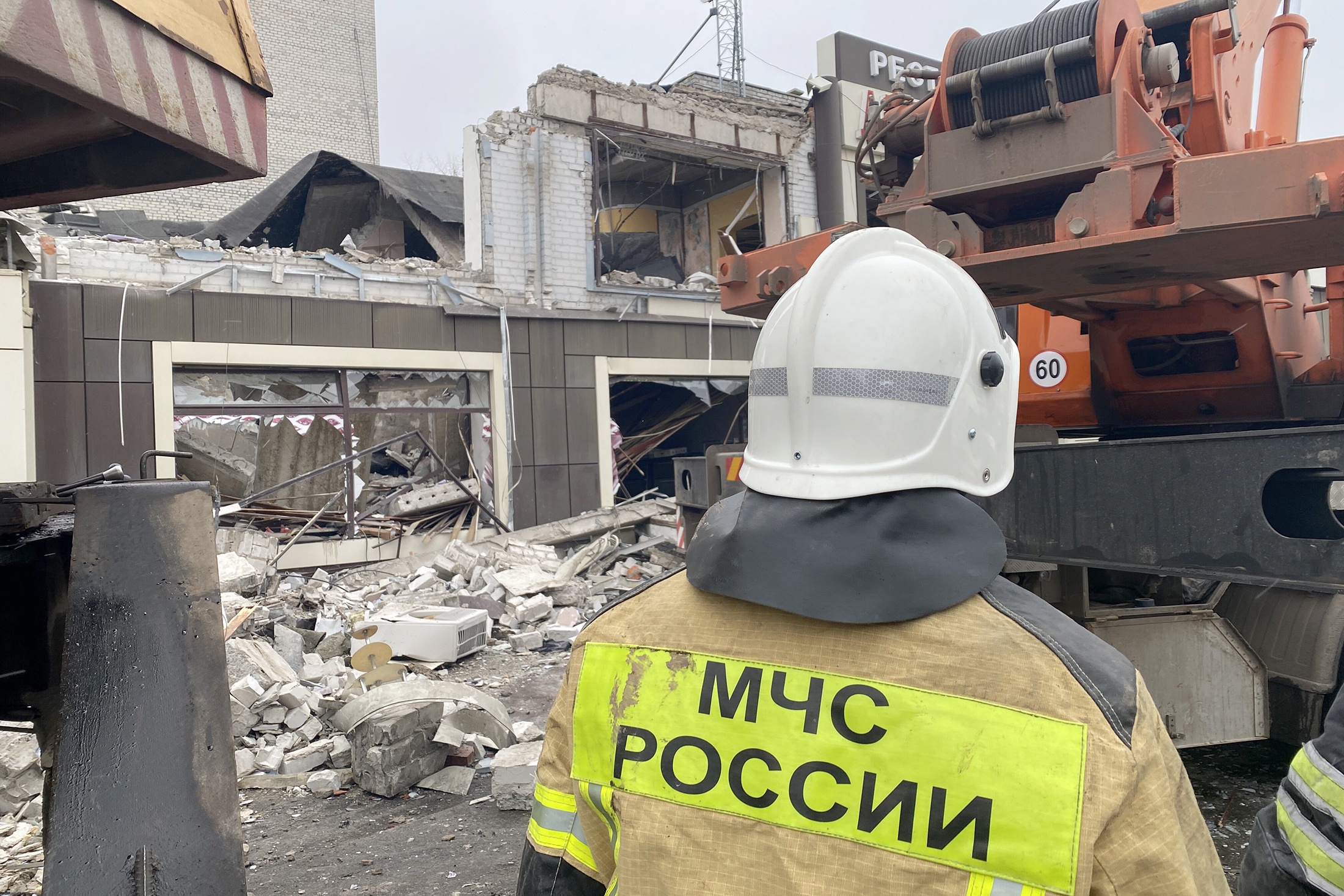 Спасатели продолжают разбор завалов на месте пекарни, используя спецтехнику.
