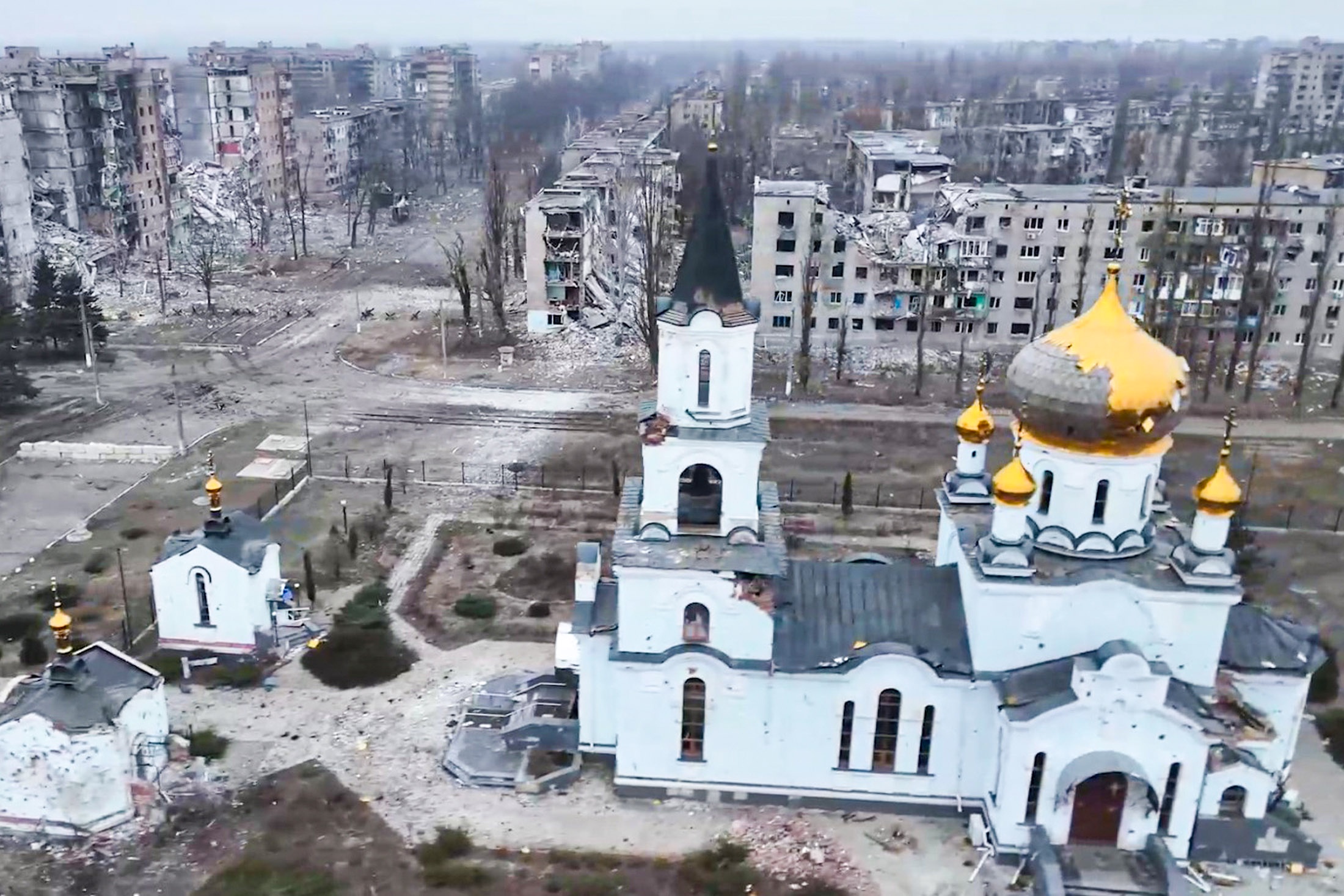 На ранее опубликованных Минобороны РФ кадрах видно, что авдеевский храм стоит почти без повреждений в окружении разрушенных домов.