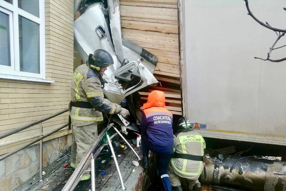 ДТП произошло на проспекте Ленина. После столкновения двух грузовиков, шофер фуры не справился с управлением и врезался в строение.