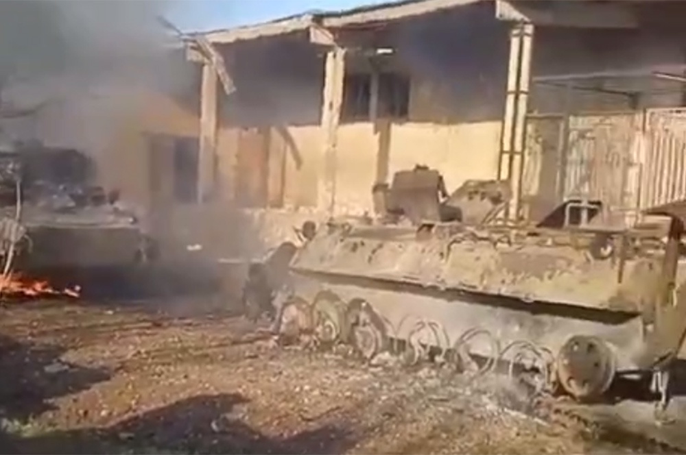 Данных о том, что же прилетело в эти "Мотолыги", пока нет, но видно, что техника интенсивно горит. Интересно, что один из образцов получил дополнительную защиту места стрелка пулемета ДШК, расположенного справа от механика-водителя.
