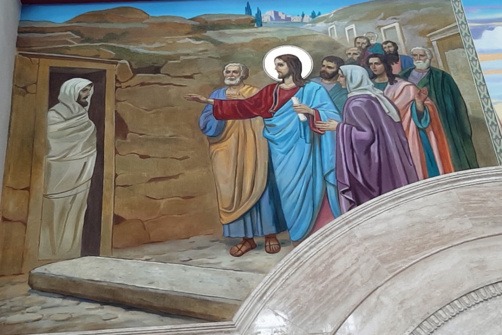 В основной части храма расписали пока только нижний ярус. Восхищенным взглядам прихожан и туристов открываются картины на евангельские сюжеты, которые одновременно отсылают к главным церковным праздникам: Воздвижение креста Господня, Воскрешение Лазаря, Крестный путь Спасителя, Рождество, Введение во храм и Успение Пресвятой Богородицы.