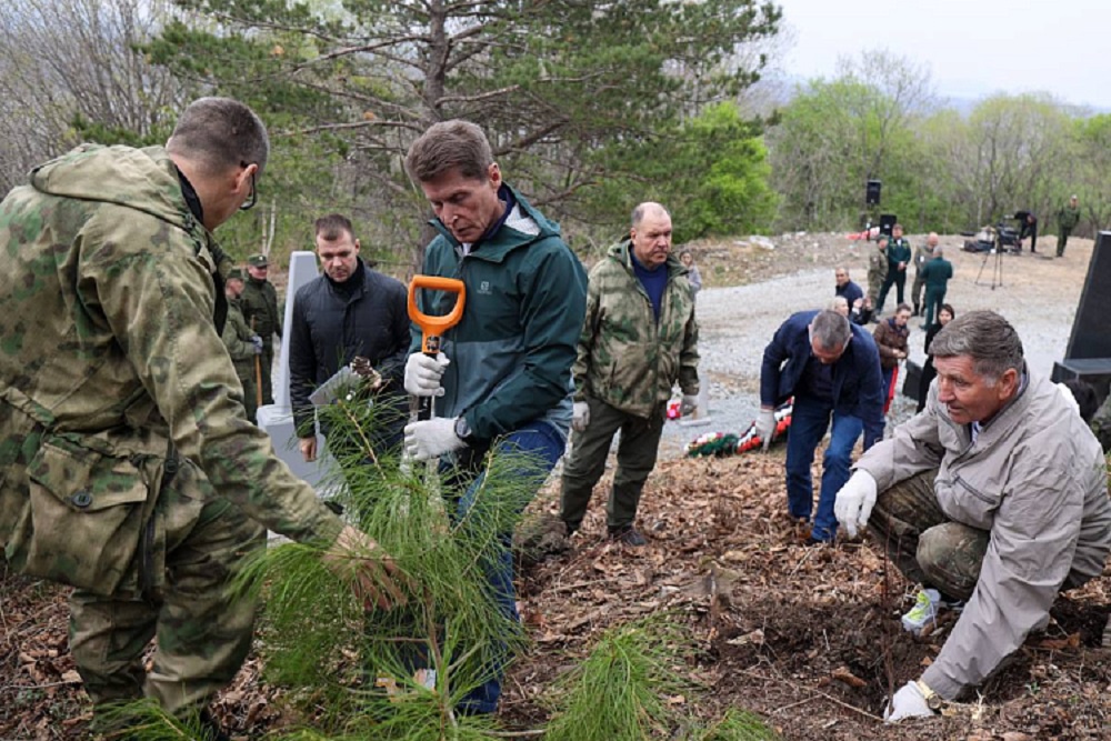 Как сообщили в правительстве Приморья, вместе с активными гражданами участие в разбивке сада принял губернатор Олег Кожемяко. На сопке высадят 1 050 деревьев - столько пограничников и красноармейцев погибли здесь, отстаивая независимость государства.